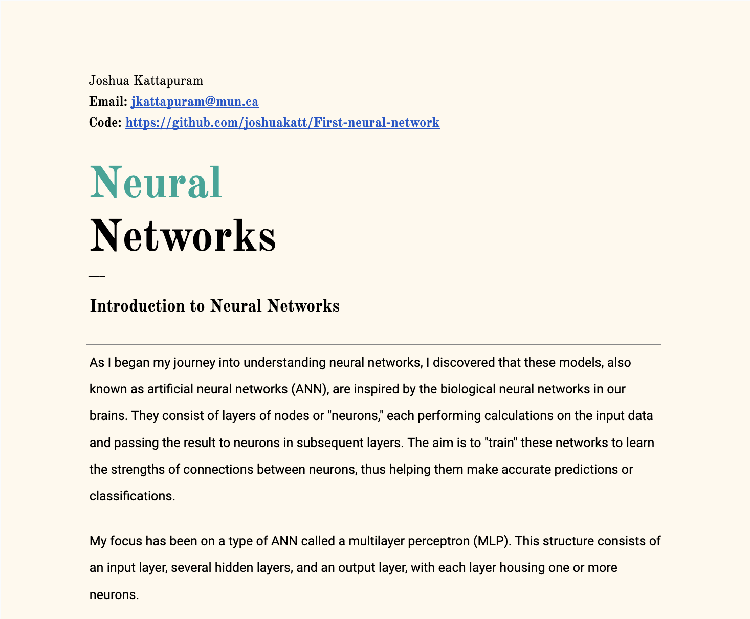 I have been very interested in the world of Machine Learning/AI. Here, you can find some notes, and my own neural network I built from scratch without any libraries.